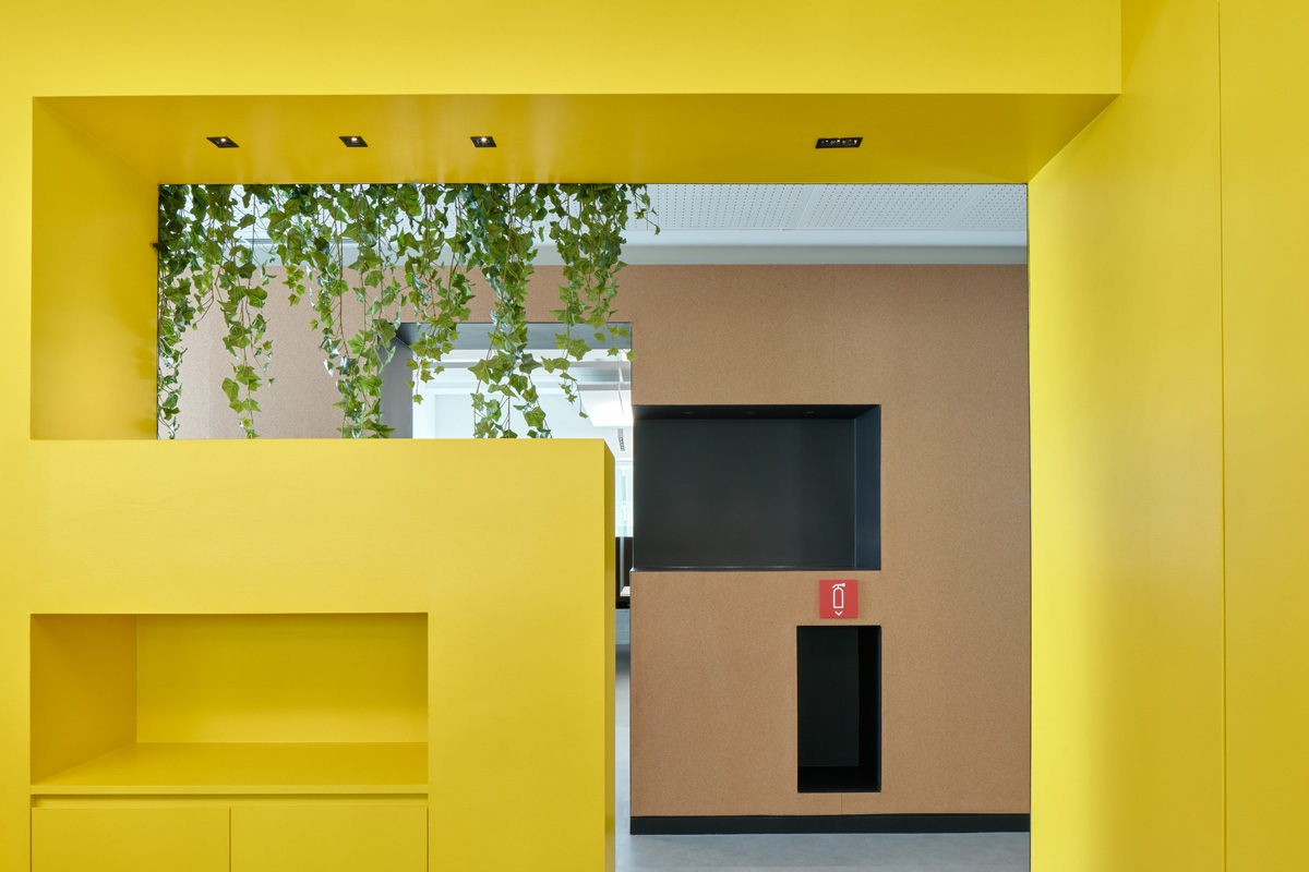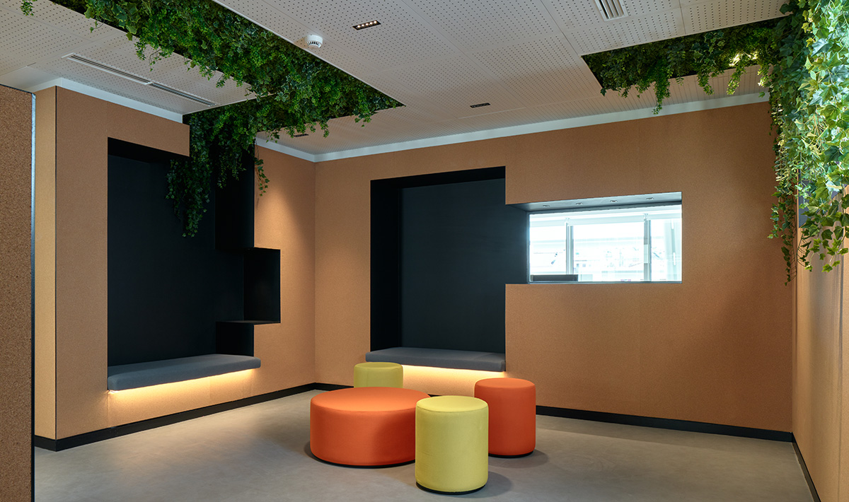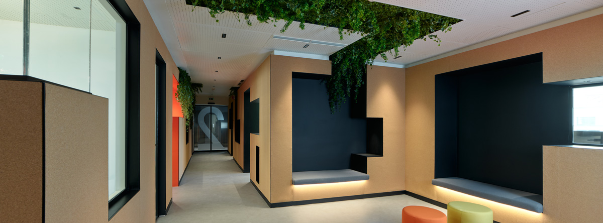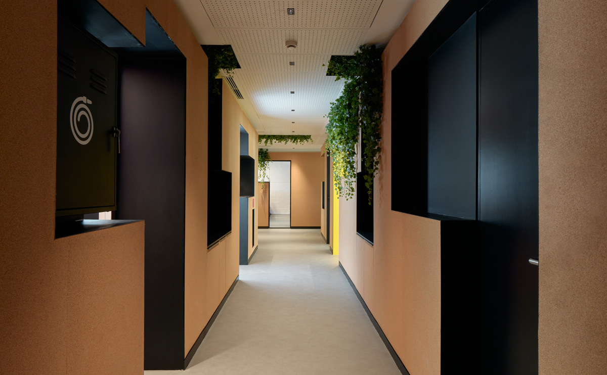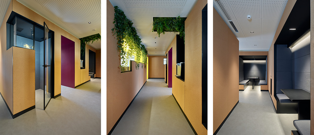 The horizontal circulation, which connects the two stairwells of the building, intersects the floor plan like a meander, and becomes central to the composition: It initially splits the floor plan into two areas which, as a result of the shaped space, can be easily divided into small groups, one of the design requirements. At the same time, the circulation has not been conceived as a mere corridor but as a lively space that hosts small sitting rooms, informal meeting spaces and discussion areas, soundproofed booths, recesses with lockers, cabinets, and openings to work groups. Characterized by the cork surfaces with orthogonal slits, it both separates and connects the individual spaces, the company’s various departments and workgroups.