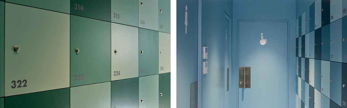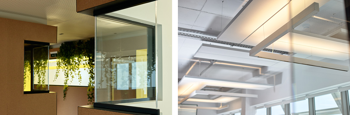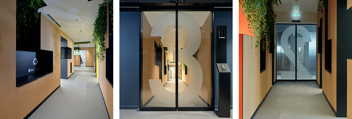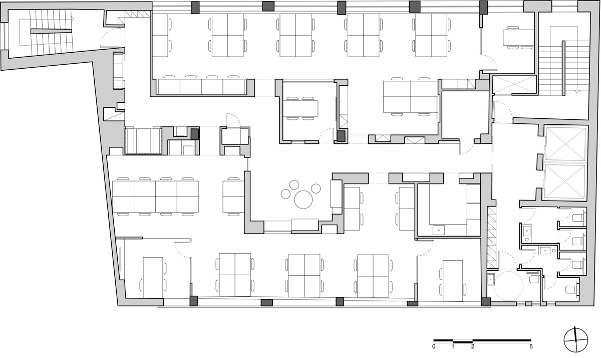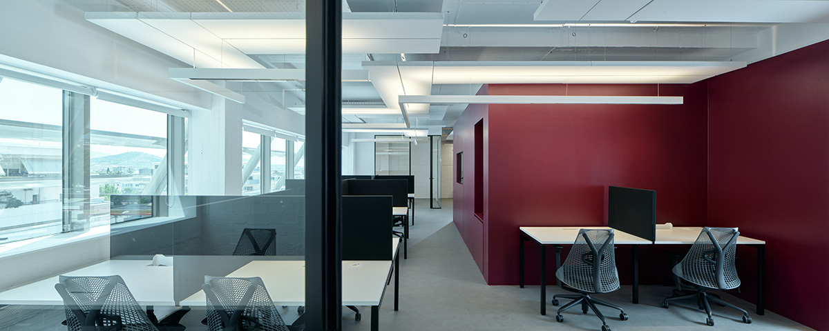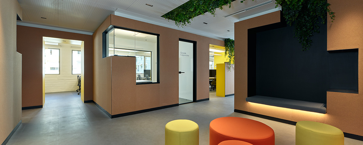 The horizontal circulation, which connects the two stairwells of the building, intersects the floor plan like a meander, and becomes central to the composition: It initially splits the floor plan into two areas which, as a result of the shaped space, can be easily divided into small groups, one of the design requirements. At the same time, the circulation has not been conceived as a mere corridor but as a lively space that hosts small sitting rooms, informal meeting spaces and discussion areas, soundproofed booths, recesses with lockers, cabinets, and openings to work groups. Characterized by the cork surfaces with orthogonal slits, it both separates and connects the individual spaces, the company’s various departments and workgroups.
