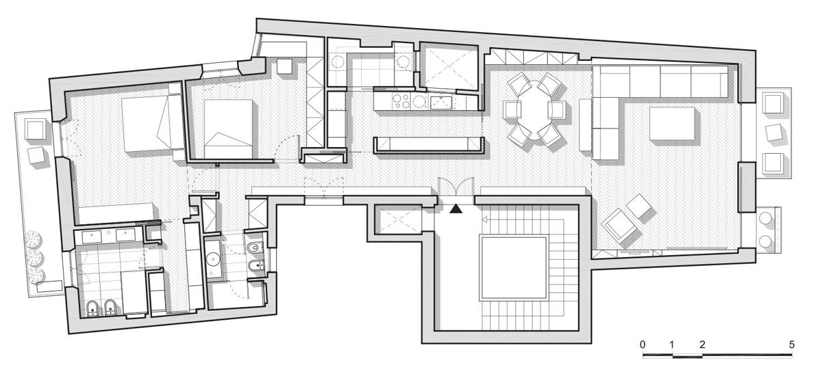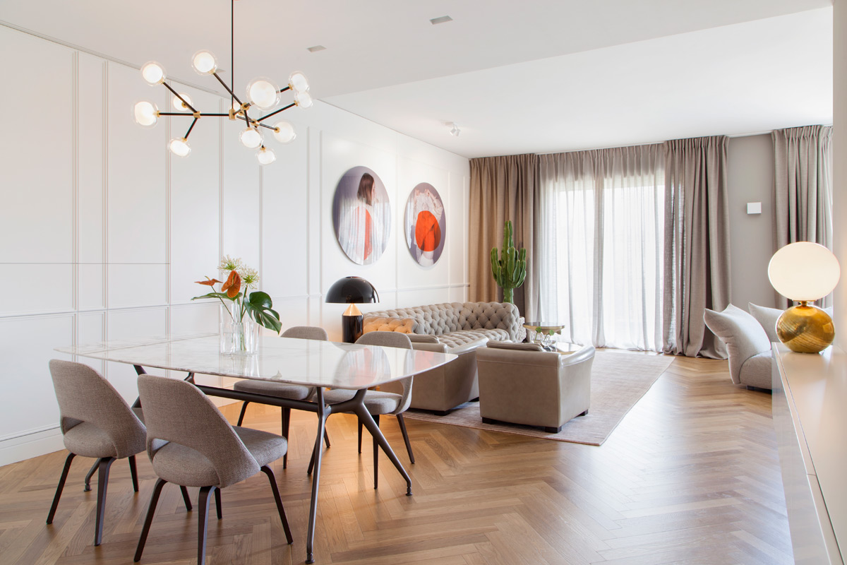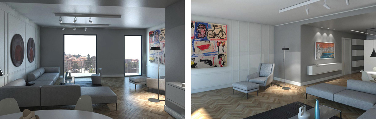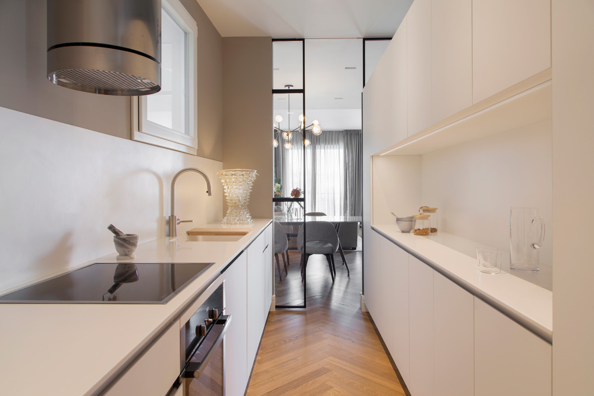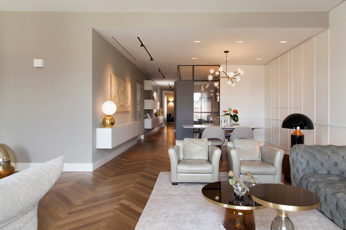 In a 1950’s building in Verona that overlooks the Adige river, the new apartment layout focused on the relocation of the primary uses in order to take maximum advantage of the existing views to the canal and surroundings. A continuous living-dining space, that overlooks the canal, connects to the oblong kitchen that can be closed off by means of glass doors. Sleeping areas include a master bedroom, with en-suite bathroom and dressing area, and a guest room with a separate bathroom. Interior finishes are meant to balance contemporary living with classical decoration.