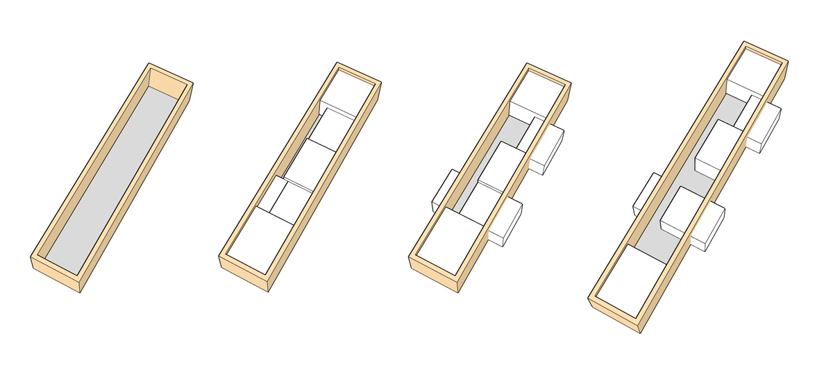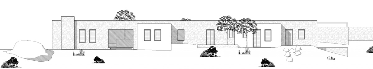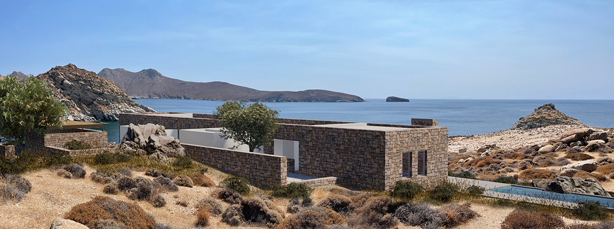A masonry envelope holds all the functions of the house, each as a separate volume, connected by outdoor circulation areas. These volumes, typical Aegean white boxes, are subsequently shifted in two directions: a. to protrude outside the stone walls, in order to break the monolithic façade (a building code requirement) and b. to create interior courts and patios, conceived as rooms without a ceiling, that become essential spaces for everyday summer living.