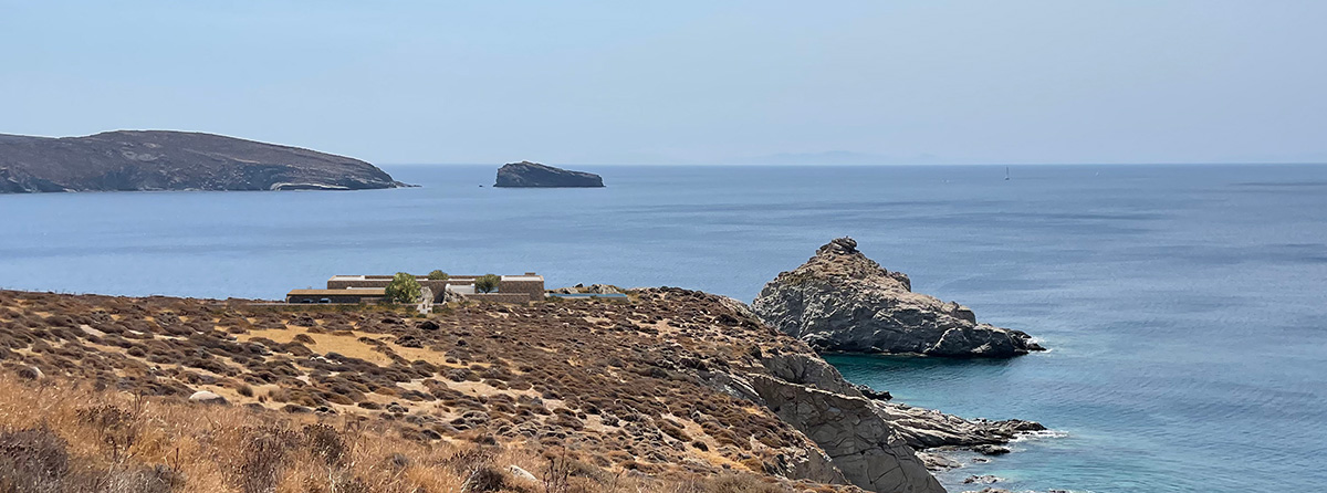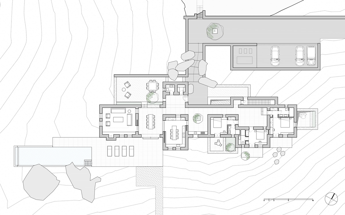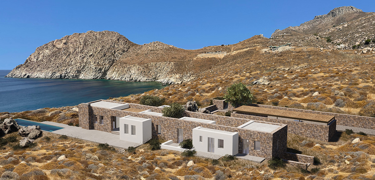 A masonry envelope holds all the functions of the house, each as a separate volume, connected by outdoor circulation areas. These volumes, typical Aegean white boxes, are subsequently shifted in two directions: a. to protrude outside the stone walls, in order to break the monolithic façade (a building code requirement) and b. to create interior courts and patios, conceived as rooms without a ceiling, that become essential spaces for everyday summer living.